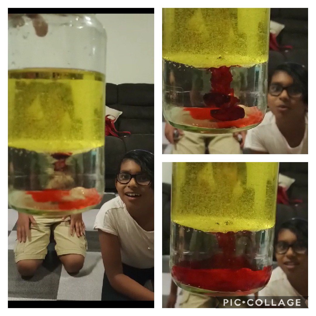 Then we dropped few Alka seltzer tablets into the jar. The tablets dissolved in water to release bubbles of carbon-di-oxide. Gas bubbles being lighter than oil rose to the top carrying a red coloured water drops along with it. When the bubbles reached the surface the broke and the red colour water drop fell to the bottom through the oil layer.
